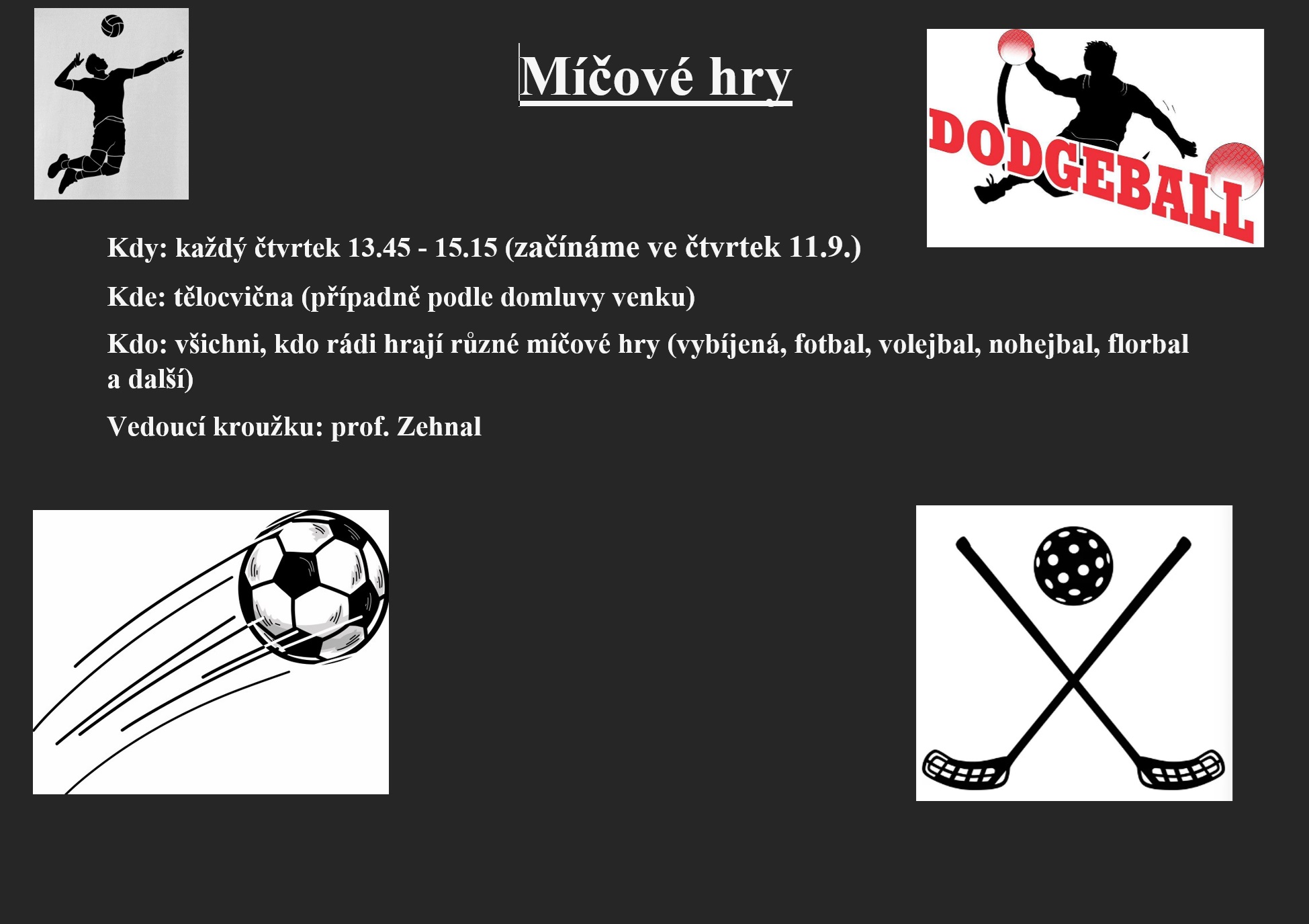 | Míčové hry | Mgr. Jan Zehnal | Čtvrtek 13:45 – 15:15 | TV | |