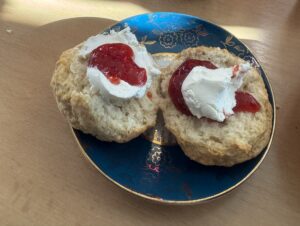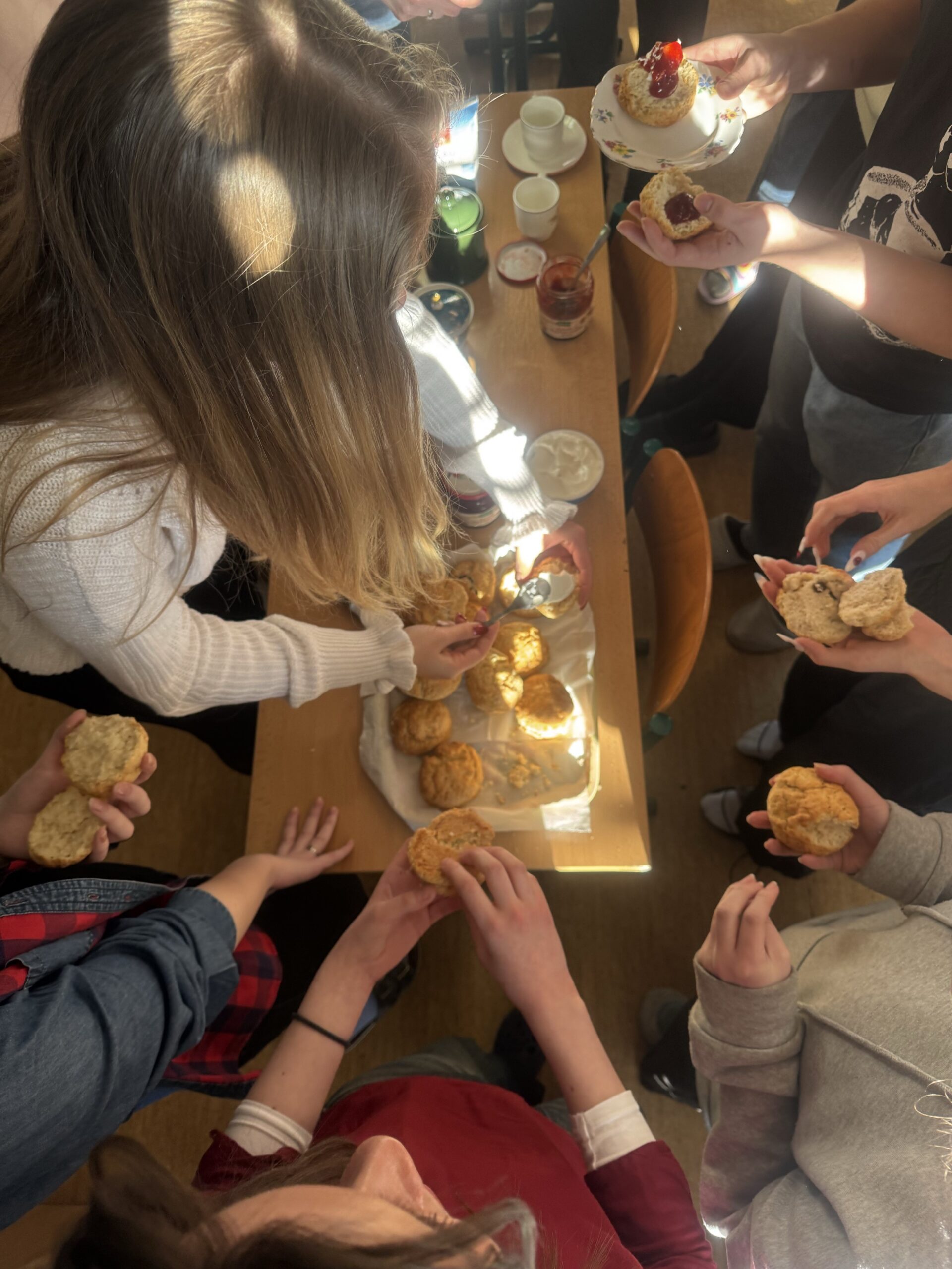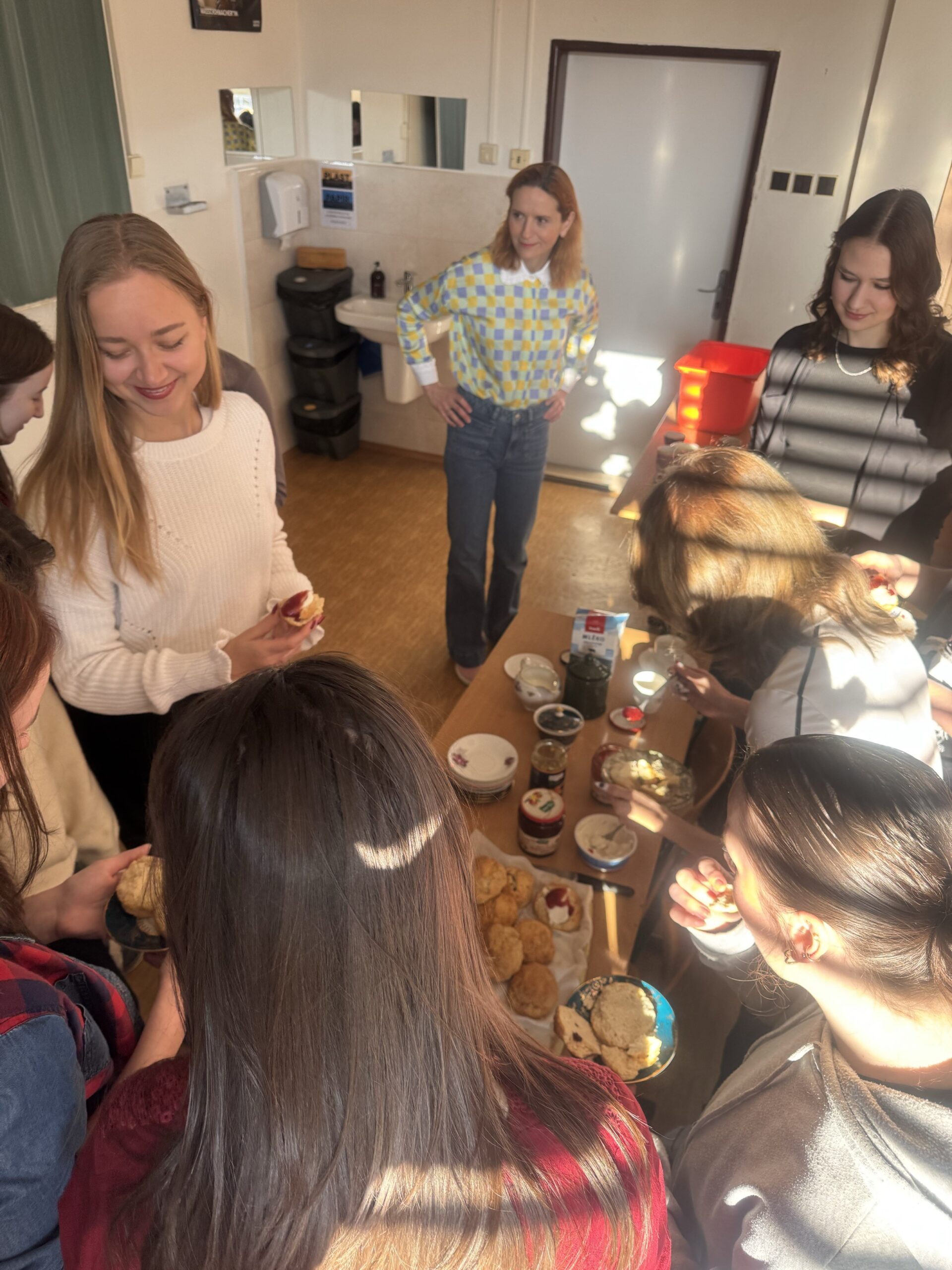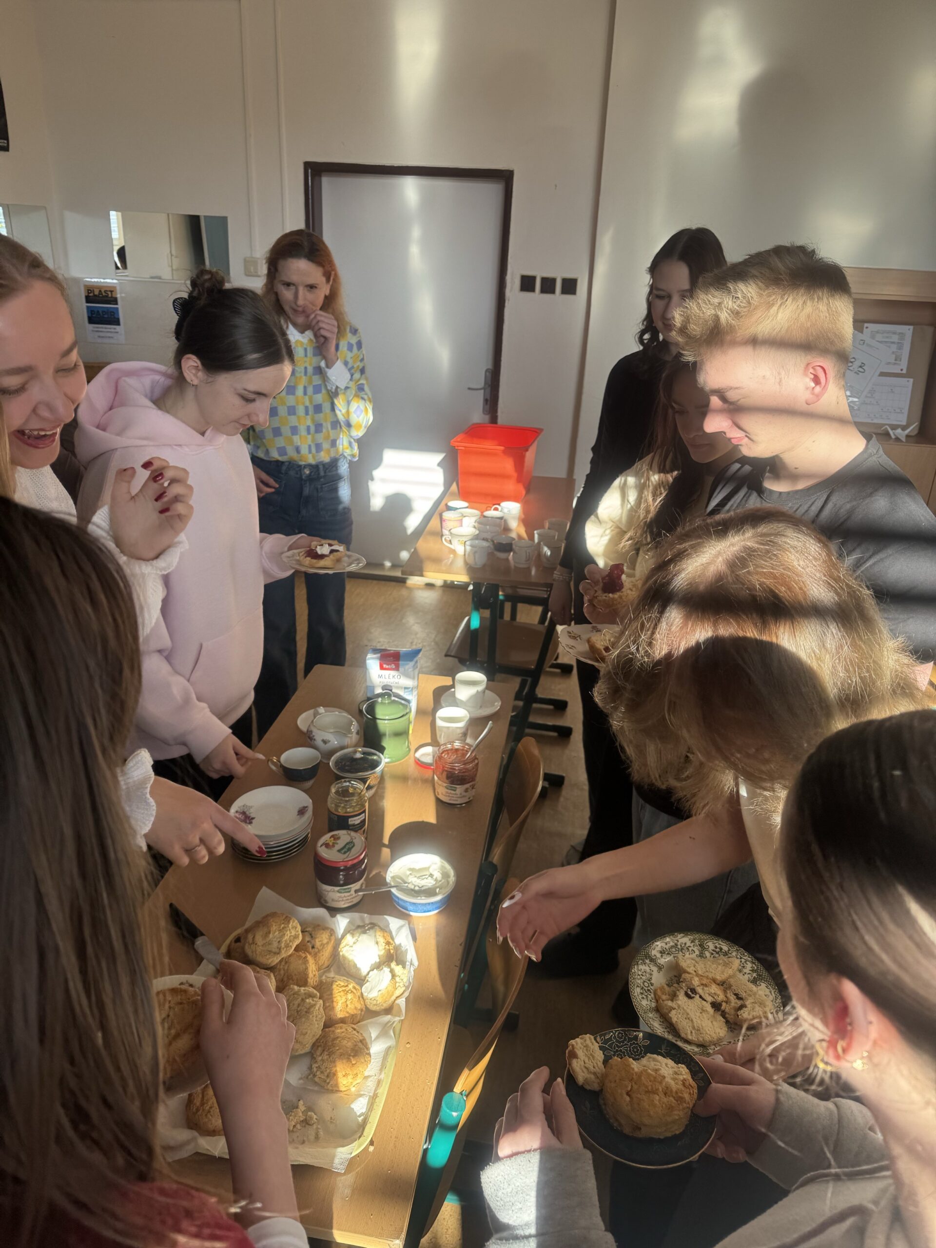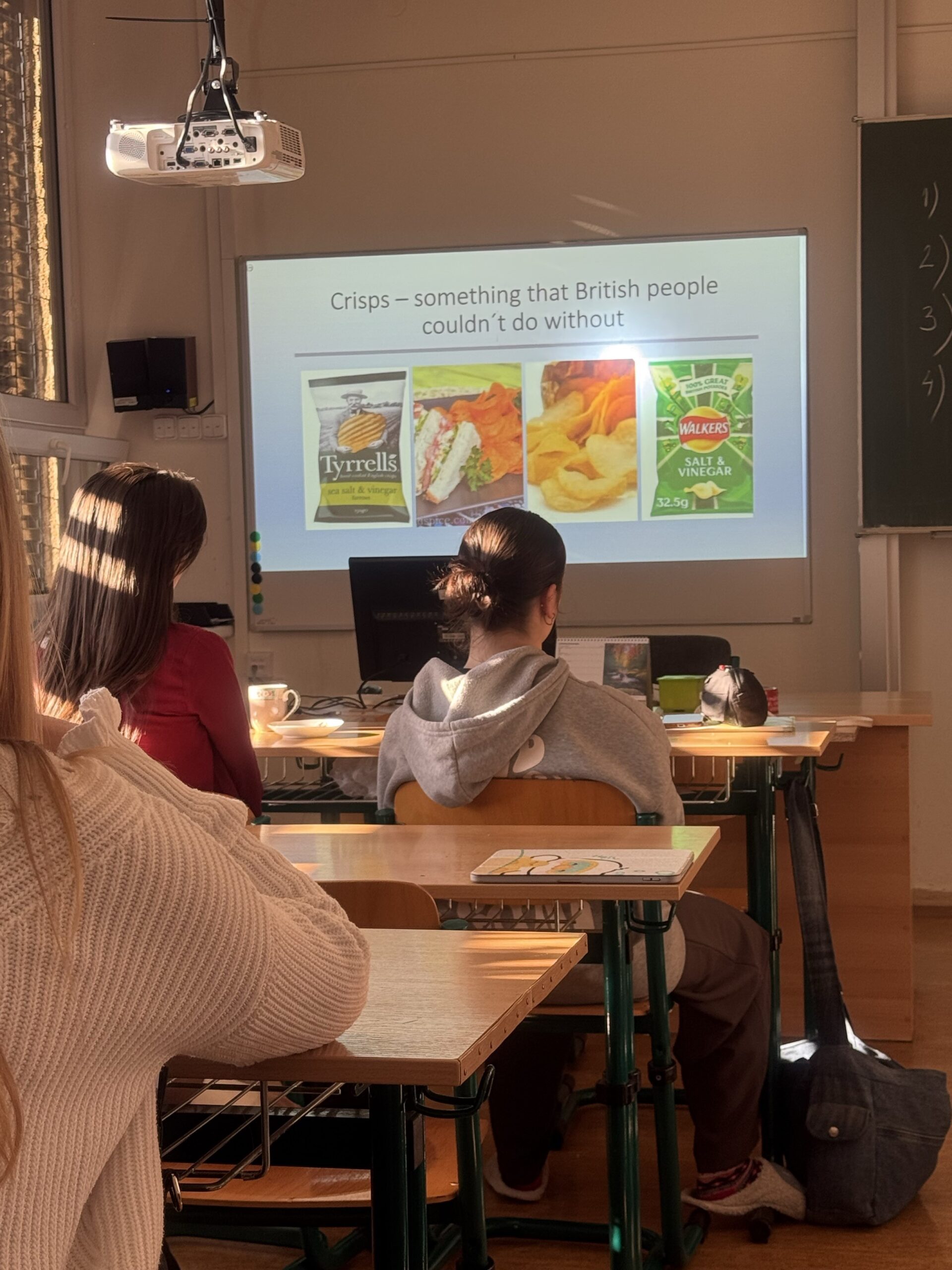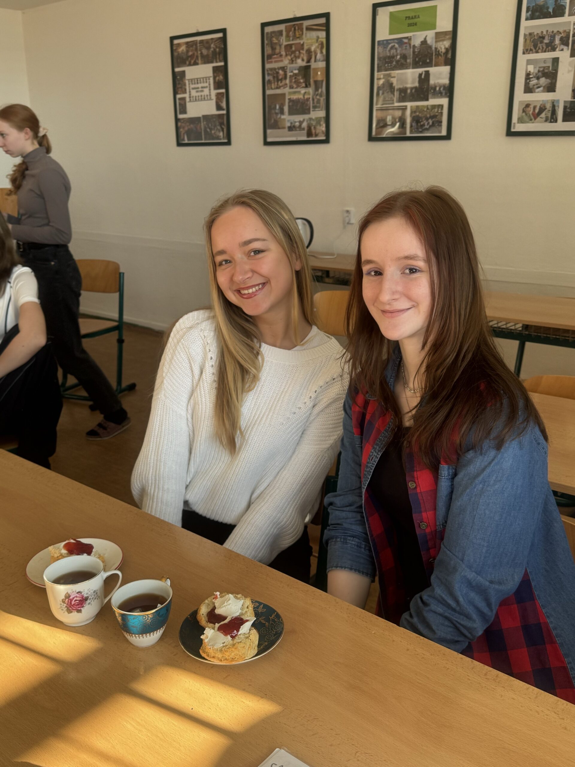 Naše kolegyně Alena Holíková nám poutavě přiblížila tradiční anglickou kuchyni, včetně pokrmů jako shepherd’s pie, toad in the hole, full English breakfast nebo fish & chips. Ale nejen to – dokonce pro nás připravila pravé anglické cream tea! Tato tradiční anglická svačinka zahrnuje čerstvě upečené scones, podávané se smetanou, džemem a samozřejmě anglickým čajem s mlékem.